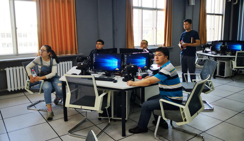 参观了基础实验室后,在王旗老师的引导下,一行来到虚拟仿真教学中心。王旗老师就虚拟仿真实验项目建设、国家级项目申报、虚拟仿真实验教学课程建设等方面进行了详细的经验分享,并与到访的各位老师就艺术学院首次增开实验教学课程、艺术专业与工科专业融合推进实验教学发展、发起和建设VR技术学生社团等事项进行了广泛而深入的探讨。
