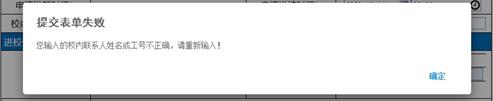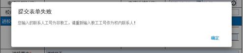 注:如发起人填写的校内联系人姓名工号不正确或填写的联系人为非教工,系统将出现如下提示,请发起人重新填写正确的教工联系人。
