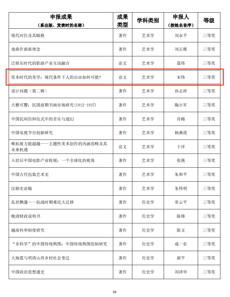 近日,教育部网站发布《教育部关于第八届高等学校科学研究优秀成果奖(人文社会科学)奖励的决定》(教社科〔2020〕4号)。我院艺术学理论系宋伟教授论文《资本时代的美学:现代条件下人的自由如何可能?》获三等奖。