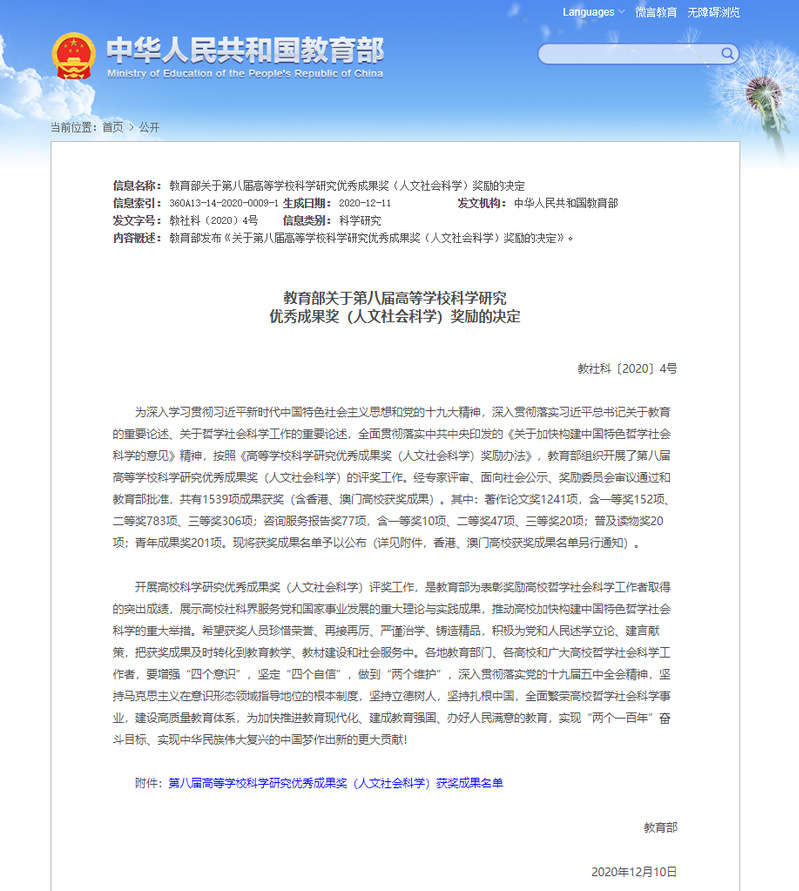 据悉,教育部高等学校科学研究优秀成果奖(人文社会科学)是中国人文社科领域最高层次的科研奖励,每三年评选一次。本次共有1539项成果获奖(含香港、澳门高校获奖成果),其中:著作论文奖1241项,含一等奖152项、二等奖783项、三等奖306项;咨询服务报告奖77项,含一等奖10项、二等奖47项、三等奖20项;普及读物奖20项;青年成果奖201项。在本届评奖工作中,东北大学共有3项成果获奖,其中二等奖1项、三等奖2项。