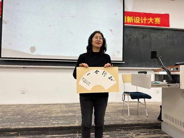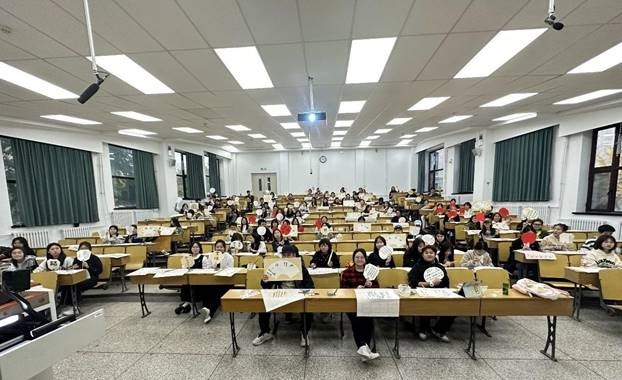 在实践交流环节,朱利演示了基本笔画的书写技巧,深入浅出地讲解了扇面书法的书写要领。在经过不断的书法临摹与练习后,同学们纷纷完成了自己的第一幅扇面书法。讲座现场气氛热烈,朱老师幽默风趣、热情投入的授课方式赢得了在场师生的热烈掌声。