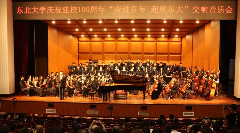 白山高高,黑水滔滔;百年华章,琴声悠扬。9月9日下午,东北大学庆祝建校100周年“奋进百年 起航东大”交响音乐会在汉卿会堂蔡冠深报告厅举行。音乐会由东北大学艺术学院青年交响乐团现场演出,用高雅音乐庆祝东北大学百岁生日,让师生在交响乐中感受音乐的魅力。近500名师生、校友现场观看音乐会。