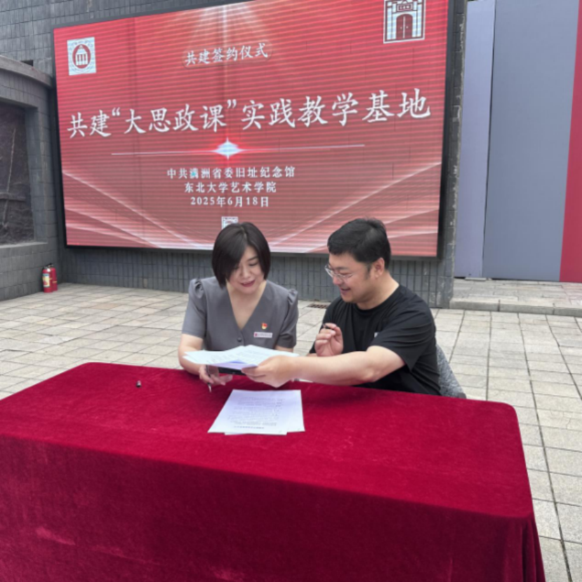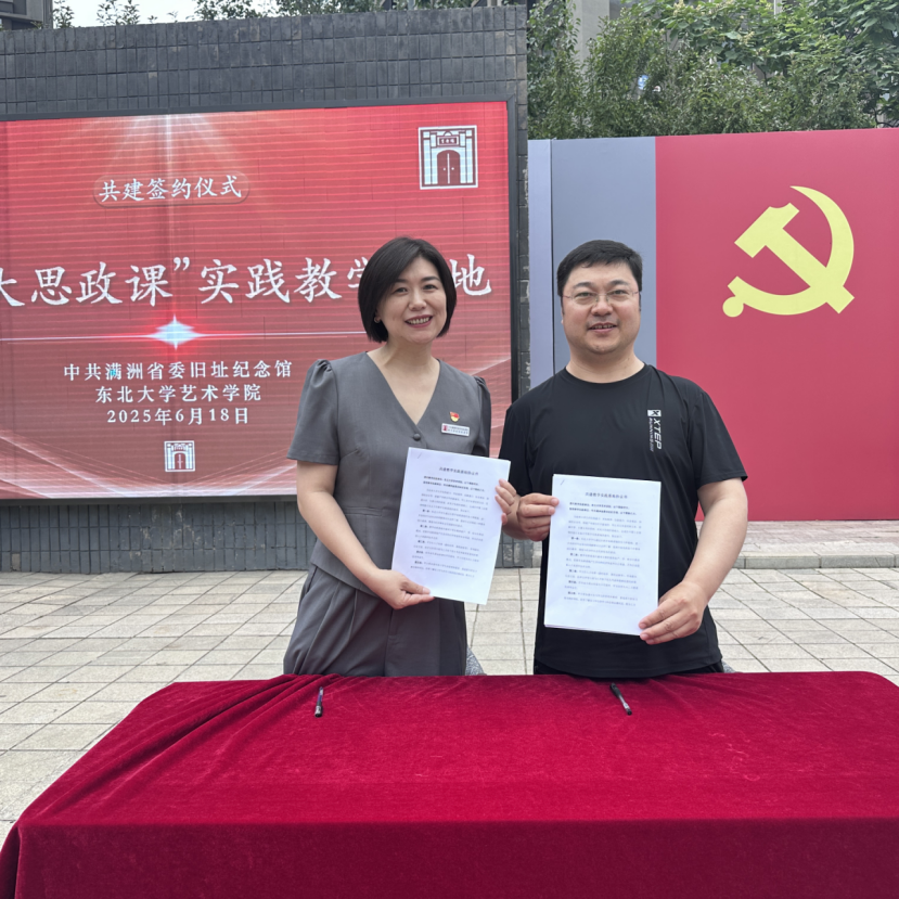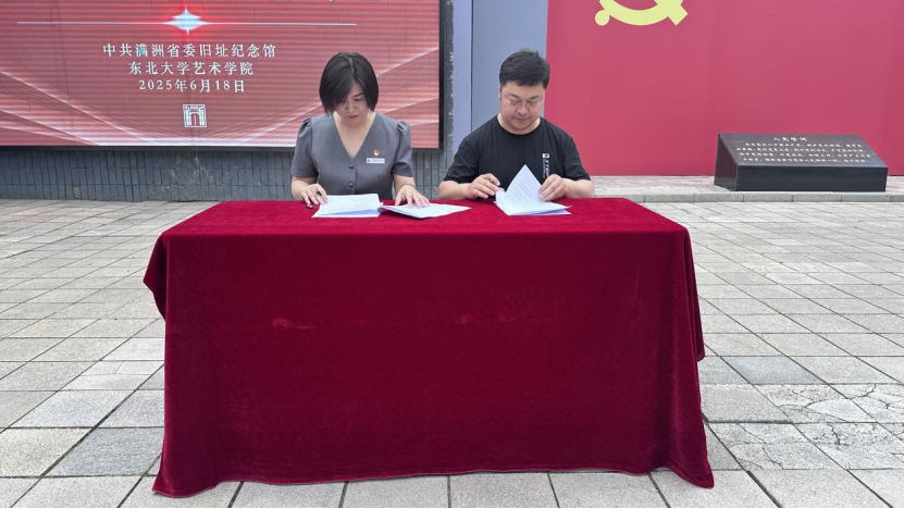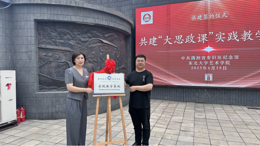 东北大学艺术学院副院长霍楷与中共满洲省委旧址纪念馆馆长车冰冰为“大思政课”实践教育基地揭牌,双方签署共建协议。